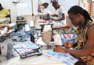 Over one million tonnes of plastic packaging waste are produced in Ghana annually, leading to pollution of streets, beaches, and sewage systems. To address this problem, Elvis and his team reuse water sachets to produce reusable bags. Collectors bring the water sachets they find on the streets to the factory and receive 2 cedis per kilo.